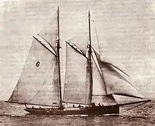 On 26 November 1898, while returning to Boston, the Varuna, No. 6, met up with the Portland Gale. Captain William McMilan, succeeded in working the Varuna out off Highland Light, when she was driven into shoal water during the storm. He had been captain of the Varuna for four years.[5] McMilan was able to board a Johnston line steamer Sedgemore, inbound from Philadelphia. Varuna's double reefed sails were damaged and her yawls washed away. The steamer was able to tow the pilot-boat from off Highland Light into the Boston harbour. Captain William McMilan, Captain William H. Fairfield and the crew were grateful to Captain Bartlett of the steamer for rescuing them. After repairs were made she resumed her duties in the pilot fleet.[6] Captain Frederick W. Ahlquist, was head boatkeeper on the Varuna and later told of the experience of surviving the storm.[7] During the gale, sister pilot-boat, the Columbia, No. 8, was driven ashore at the Sand Hills beach in Scituate, Massachusetts with the loss of all five men aboard. Captain Thomas Cooper was transferred from the Columbia to the Varuna, as he had ownership in the Varuna.[3]