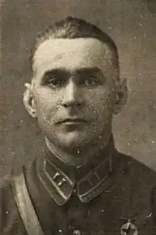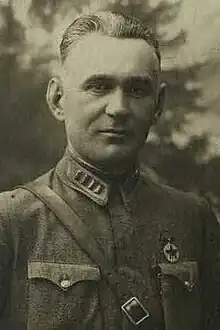 Karuna received command training at the 2nd Borisoglebsk-Petrograd Cavalry School in Petrograd between August 1920 and September 1923. While at the school, he took part in the suppression of the Kronstadt rebellion.[1] On graduation, Karuna was appointed to command a machine gun platoon of the 61st Cavalry Regiment of the 8th Cavalry Division of the Turkestan Front. He took part in the suppression of the Basmachi movement in Eastern Bukhara, being credited with the destruction of the fighters led by Mustafakul in 1925, and was wounded in the fighting that year.[1] For these actions, he was awarded a gilded saber by the Volga Military District Military Council in 1929.[2]