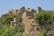 Vatheia (Greek: Βάθεια [ˈvaθça]; also Vathia) is a village on the Mani Peninsula, in south-eastern Laconia. The local community of Vatheia is named after this village. The aforementioned local community is a subdivision of the municipal unit of Oitylo. It is known for its tower-houses built on a hill dominating the surrounding countryside. Vatheia is linked by road north to Areopoli and Kalamata and south to Cape Matapan also known as Tenaro. In the northern and eastern direction, the southern reaches of the Sangias mountain range overlook the village. Farmland and maquis shrubland cover the hill slopes. On the hills and mountain sides around Vatheia proper are clusters of abandoned houses, towers and chapels known as the perichora, meaning environs. Currently, Vatheia is a tourist attraction during spring and summer due to the abundance of wild flowers that cover the nearby hills and its scenic views. Moreover, it is an iconic example of the south Maniot vernacular architecture as it developed during the 18th and 19th centuries. The nearest villages are Kyparissos, Alika and Gerolimenas to the north-west and Lagia to the north-east.