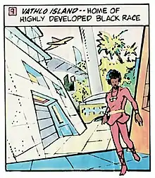 Half a year later, in Superman #239 (June 1971), a panel drawn by artist Sal Amendola described a "Vathlo Island" in the "Old World" hemisphere of Krypton as being populated by a "highly developed black race".[2]