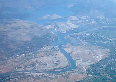 Vau i Dejës (or Vau Dejës or Vau-Dejës) also refers to the city center for the municipality, which is sometimes referred to as Laç or Laç-Vau i Dejës. Located in the northern region of Zadrima, Vau i Dejës is intersected by the Drin and Gjadër rivers. It is also strategically about 41 kilometres from the Adriatic Sea. Settlements in the area can be dated back to the 15th century, while the main city of Vau i Dejës was developed to house workers during the construction of the Vau i Dejës hydroelectric dam from 1971- 73.[4] After the completion of the dam, families displaced from the floodwaters began to inhabit the city. Today Vau i Dejës is composed of 8 villages and a city center. The population in 2008 was 12,345. The municipality covers a total of 31 km and is composed of 1 city center and 8 villages. The villages of Vau i Dejës are Mjedë, Spathar, Shelqet, Kacë, Narac, Dush, Gomsiqe and Karmë.[5] It is the seat of the Roman Catholic Diocese of Sapë.