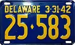 1941 | Golden yellow on blue; "DELAWARE 3-31-42" at top | 12♦345 | 1 to approximately 59♦000 |