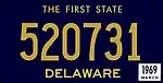 1969 | Screened gold serial on reflective dark blue plate with gold border; "DELAWARE" centered at bottom | "THE FIRST STATE" centered at top | 123456 | 4 to 9999991-2 | Several variations of the font used for the serial exist. Some replacement plates have riveted numbers. |
