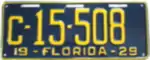 1929 | Embossed yellow serial on dark blue plate with border line; "19-FLORIDA-29" at bottom | none | C-123-456 | C-1 to approximately C-321-000 | |