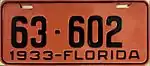 1933 | Embossed black serial on orange plate with border line; "1933–FLORIDA" at bottom | none | 123-456 | 1 to approximately 235-000 | Weight classes same as 1932, but with D used as a suffix instead of a prefix. |