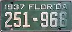 1937 | Embossed white serial on green plate with border line; "1937 FLORIDA" at top | none | 12-345T 123-456 12-345D 1-234 W |
