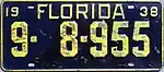 1938 | Embossed yellow serial on black plate with border line; "FLORIDA" centered at top; "19" at top left and "38" at top right | none | T1-1-234 T10-123 1-12-345 10-1-234 D1-12-345 D10-1-234 W1-1-234 W10-123 |