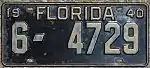1940 | Embossed white serial on black plate with border line; "FLORIDA" centered at top; "19" at top left and "40" at top right | none | 1T-123 10T-123 1-12345 10-1234 1D12345 10D1234 1W-1234 10W-123 |