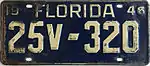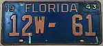 1942–43 | Embossed orange serial on dark blue plate with border line; "FLORIDA" centered at top; "19" at top left and "42" at top right | none | 1T-123 10T-12 1-1234 10-123 1D12345 10D1234 1W12345 10W1234 1WW-123 10WW-12 |