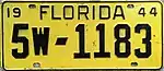 1944 | Embossed black serial on yellow plate with border line; "FLORIDA" centered at top; "19" at top left and "44" at top right | none | 1T-123 10T-12 1-1234 10-123 1D12345 10D1234 1W12345 10W1234 1WW-123 10WW-12 |