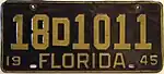 1945 | Embossed yellow serial on black plate with border line; "FLORIDA" centered at bottom; "19" at bottom left and "45" at bottom right | none | 1T-123 10T-12 1-1234 10-123 1D12345 10D1234 1W12345 10W1234 1WW-123 10WW-12 |
