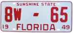 1949 | Embossed red serial on white plate with border line; "FLORIDA" centered at bottom; "19" at bottom left and "49" at bottom right | "SUNSHINE STATE" centered at top | 1T-1234 10T-123 1D-1234 10D-123 1-12345 1-1234A 10-1234 10-123A 1W12345 10W1234 1WW1234 10WW123 |