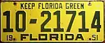 1951 | Embossed dark green serial on yellow plate with border line; "FLORIDA" centered at bottom; "19" at bottom left and "51" at bottom right | "KEEP FLORIDA GREEN" centered at top | 1T-1234 10T-123 1D-1234 10D-123 1-123456 10-12345 1W12345 10W12345 1WW-123 10WW123 |