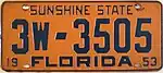 1953 | Embossed blue serial on orange plate with border line; "FLORIDA" centered at bottom; "19" at bottom left and "53" at bottom right | "SUNSHINE STATE" centered at top | 1T-1234 10T-123 1D-1234 10D1234 1-123456 10-12345 1W12345 10W12345 1WW-123 10WW123 |