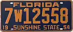 1954 | Similar to 1952 base, but with "19" at bottom left and "54" at bottom right | "SUNSHINE STATE" as on 1952 base | 1T-1234 10T-123 1D-1234 10D1234 1-123456 10-12345 1W12345 10W12345 1WW-123 10WW123 |