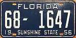 1956 | Embossed white serial on blue plate with border line; "FLORIDA" centered at top; "19" at bottom left and "56" at bottom right | "SUNSHINE STATE" centered at bottom | 1T-1234 10T-123 1D-1234 10D-1234 1-123456 10-12345 1W123456 10W12345 1WW-1234 10WW1234 |