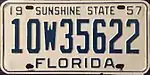 1957 | Embossed blue serial on white plate with border line; "FLORIDA" centered at bottom; "19" at top left and "57" at top right | "SUNSHINE STATE" centered at top | 1T-1234 10T-1234 1D-1234 10D-1234 1-123456 10-12345 1W123456 10W12345 1WW-1234 10WW1234 |