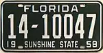 In 1956, the United States, Canada, and Mexico came to an agreement with the American Association of Motor Vehicle Administrators, the Automobile Manufacturers Association and the National Safety Council that standardized the size for license plates for vehicles (except those for motorcycles) at 6 inches (15 cm) in height by 12 inches (30 cm) in width, with standardized mounting holes.[3] The 1955 (dated 1956) issue was the first Florida license plate that complied with these standards.