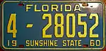 1960 | Embossed yellow serial on royal blue plate with border line; "FLORIDA" centered at top; "19" at bottom left and "60" at bottom right | "SUNSHINE STATE" centered at bottom | 1T-12345 10T-1234 1D-12345 10D-1234 1-123456 10-12345 1W123456 10W12345 1WW12345 10WW1234 |