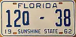 1962 | Embossed blue serial on white plate with border line; "FLORIDA" centered at top; "19" at bottom left and "62" at bottom right | "SUNSHINE STATE" centered at bottom | 1D-12345 10D12345 1-123456 10-12345 1W123456 10W12345 1WW12345 10WW1234 10W/W12345 |