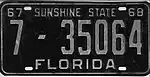 April 1967 – April 1968 | Embossed white serial on black plate with border line; "FLORIDA" centered at bottom; "67" at top left and "68" at top right | "SUNSHINE STATE" centered at top | 1D-12345 10D12345 1-123456 10-123456 1W123456 10W12345 10/W-123456 1WW12345 10WW1234 10W/W12345 |