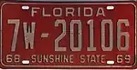 May 1968 – May 1969 | Embossed white serial on red plate with border line; "FLORIDA" centered at top; "68" at bottom left and "69" at bottom right | "SUNSHINE STATE" centered at bottom | 1D-12345 10D12345 1-123456 10-123456 1W123456 10W12345 10/W-123456 1WW12345 10WW1234 10W/W12345 |