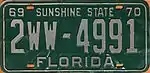 June 1969 – June 1970 | Embossed white serial on green plate with border line; "FLORIDA" centered at bottom; "69" at top left and "70" at top right | "SUNSHINE STATE" centered at top | 1D-12345 10D12345 1-123456 10-123456 1W123456 10W12345 10/W-123456 1WW12345 10WW1234 10W/W12345 |