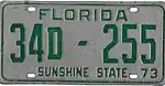 July 1972 – June 1973 | Embossed green serial on reflective white plate with border line; "FLORIDA" centered at top; "73" at bottom right | "SUNSHINE STATE" centered at bottom | 1D123456 10D12345 1-123456 10-123456 1W123456 10W12345 10/W-123456 1WW12345 10WW1234 10W/W12345 |