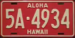 1957–60 | Embossed white on red with border line; "HAWAII" centered at bottom | "ALOHA" centered at top | 1A-123 A-123 A-1234 1A-1234 |