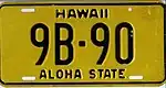 1969–75 | Embossed black on reflective yellow with border line; "HAWAII" centered at top; "69" etched at top right | "ALOHA STATE" centered at bottom | 1A-1234 A-1234 K-12345 |