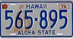 1976–80 | Embossed blue on reflective white with border line; "HAWAII" centered at top; pink graphics of King Kamehameha I and Diamond Head screened in background; red hibiscus screened at top left and "76" at top right | "ALOHA STATE" centered at bottom | 1A-1234 A-12345 |