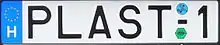 - Since October, 2015 it is possible to ask for green backgrounded plates for plug-in hybrids and electric cars which meet certain criteria.[15] Owners of these cars enjoy some benefits (e.g.: free parking in Budapest and some other cities).[16] Usually certain letter combinations are dedicated from the normal series which are all green plates from 001 to 999. These letter combinations are: NLE, NNB, PAV, PDA, PMY, PPZ, PUL, PXA, PYA, REW, RIA, RKZ, RMY, RMZ, RNY, RPZ, RVZ, RZZ, SAA, SAB, SDZ, SEA, SEZ, SFZ, SHA, SIZ, SJZ, SMZ, SNY, SNZ, SOZ, SPA, SPY, SRA, SRZ, STZ, SUZ, SVZ, SXA, SXZ and SZX as of 2021. White plates from the normal series can be requested to be remade as a green plate, if the car meets the requirements.