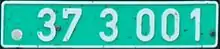 Reserved and used by diplomatic corps. Plates have a green background and white characters; they do not have blue sidebar on the left side. The numbers are made up of six digits, grouped 01 3 123, with the first two digits denoting the embassy or other diplomatic or consular representation: