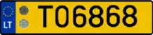 Originally the license plates had a space in the middle for stickers; the stickers were discontinued after April 2018. Plates issued since October 2023 bear the coat of arms of Lithuania between the right side of the EU stripe and the number (above the EU stripe for two-line or narrow plates).