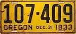 July 1 – December 31, 1933 | Embossed black serial on golden yellow plate with border line; "OREGON DEC. 31 1933" at bottom | 123-456 | 1 to approximately 218-000 | |