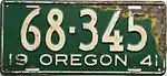 1941 | Embossed white serial on green plate with border line; "19 OREGON 41" at bottom | 123-456 | 1 to approximately 390-000 | |