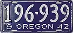 1942–45 | Embossed white serial on blue plate with border line; "19 OREGON 42" at bottom | 123-456 | 1 to approximately 495-000 | Revalidated for 1943, 1944 and 1945 with windshield stickers, due to metal conservation for World War II. |
