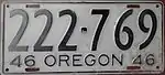 1946 | Embossed black serial on gray plate with border line; "46 OREGON 46" at bottom | 123-456 | 1 to approximately 480-000 | Only rear plates issued due to ongoing metal shortages. A windshield sticker was carried at the front of the vehicle. |