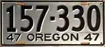 1947 | Embossed black serial on unpainted aluminum plate with border line; "47 OREGON 47" at bottom | 123-456 | 1 to approximately 458-000 | |