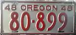 1948 | Embossed red serial on unpainted aluminum plate with border line; "48 OREGON 48" at top | 123-456 | 1 to approximately 511-000 | |