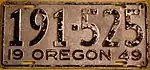 1949 | Embossed black serial on unpainted aluminum plate with border line; "19 OREGON 49" at bottom | 123-456 | 1 to approximately 567-000 |