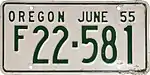 In 1956, the United States, Canada, and Mexico came to an agreement with the American Association of Motor Vehicle Administrators, the Automobile Manufacturers Association and the National Safety Council that standardized the size for license plates for vehicles (except those for motorcycles) at 6 inches (15 cm) in height by 12 inches (30 cm) in width, with standardized mounting holes.[2] The 1955 (dated 1956) issue was the first Oregon license plate that complied with these standards.