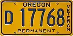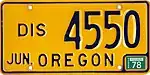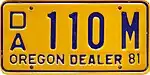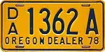Dealer | 1977-1983 | Blue on gold with "OREGON DEALER" and 2-digit year or valiation sticker at bottom | D/A 1234 A | Issued to dealers with current business license | |