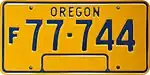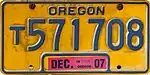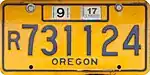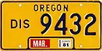 For-Rent | Blue on gold; "OREGON" at top and "DEC." and year of expiration at bottom | F/R 1-2345 | Issued to trailers having a loaded weight of 8,000 lb or less that are for hire and are equipped with pneumatic tires. All plates expire on December 31 of the stated year. | ||