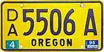 1984-early 2000s | Blue on gold with "OREGON" at bottom; 1984 issues included "84" at bottom, other years used validation stickers | D/A 1234 A D/A 1234AB D/A 1234 A/B | |||