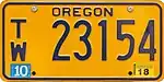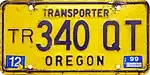 Tow Truck | Blue on gold; "OREGON" at top | T/W 12345 | T/W 00001 to present | Issued to individuals who tow vehicles not owned by them in tow and recovery operations for direct or indirect compensation. Also issued to businesses which must transport damaged, disabled or abandoned vehicles. | |