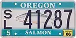 Salmon | 1998–2021 | Dark blue on multicolored background. Embossed serials. Discontinued September 1, 2021. | S/L 12345 | S/L 00001 to S/L 93326 (as of May 8, 2021) | $30 surcharge supports the Oregon Watershed Enhancement Board and the Oregon Parks and Recreation Department and is charged at each renewal time (every two years). First available in February 1998, the Salmon design has been less popular than had been expected, and by 2002 had only raised about one-third as much revenue as originally predicted.[6] |