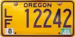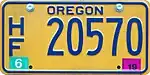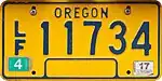 Low-Speed Vehicle | Blue on gold; "OREGON" at top and sticker box at bottom | L/S 12345 | L/S 00001 to ? | Issued to four-wheeled vehicles with a maximum speed of between 20 and 25 miles per hour. | |