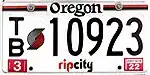 Portland Trail Blazers | September 1, 2016 – present | Black on white background, with Trail Blazer colors around border. Embossed serials. | T/B 12345 | T/B 00001 to T/B 35106 (as of May 22, 2022) | The design includes the Trail Blazers pin wheel between the stacked TB and the numbers, 'ripcity' at the bottom and red, black and gray stripes at the top. Also available as a vanity plate and as an amateur radio operator (ham) plate. |