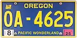 1955 | Embossed golden yellow serial on blue plate with border line; month of expiration, "OREGON" and "56" at top | none | 1A-1234 | Letter corresponds to month of expiration (see right) | Letters A through M (excluding I) were used for January through December respectively, followed by letters N through Z (excluding O). All 1955–59 plates were revalidated with tabs each year until 1960 and with stickers thereafter, while all "Pacific Wonderland" plates were revalidated with stickers. |